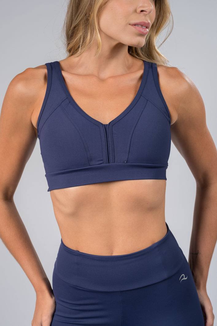 Feito com alças largas, sob-busto reforçado e decote em ‘V’ com busto triangular. Este designer anatômico com recortes estruturados garante suporte médio e conforto extremo. Ideal para treinos de intensidade moderada e uso casual.